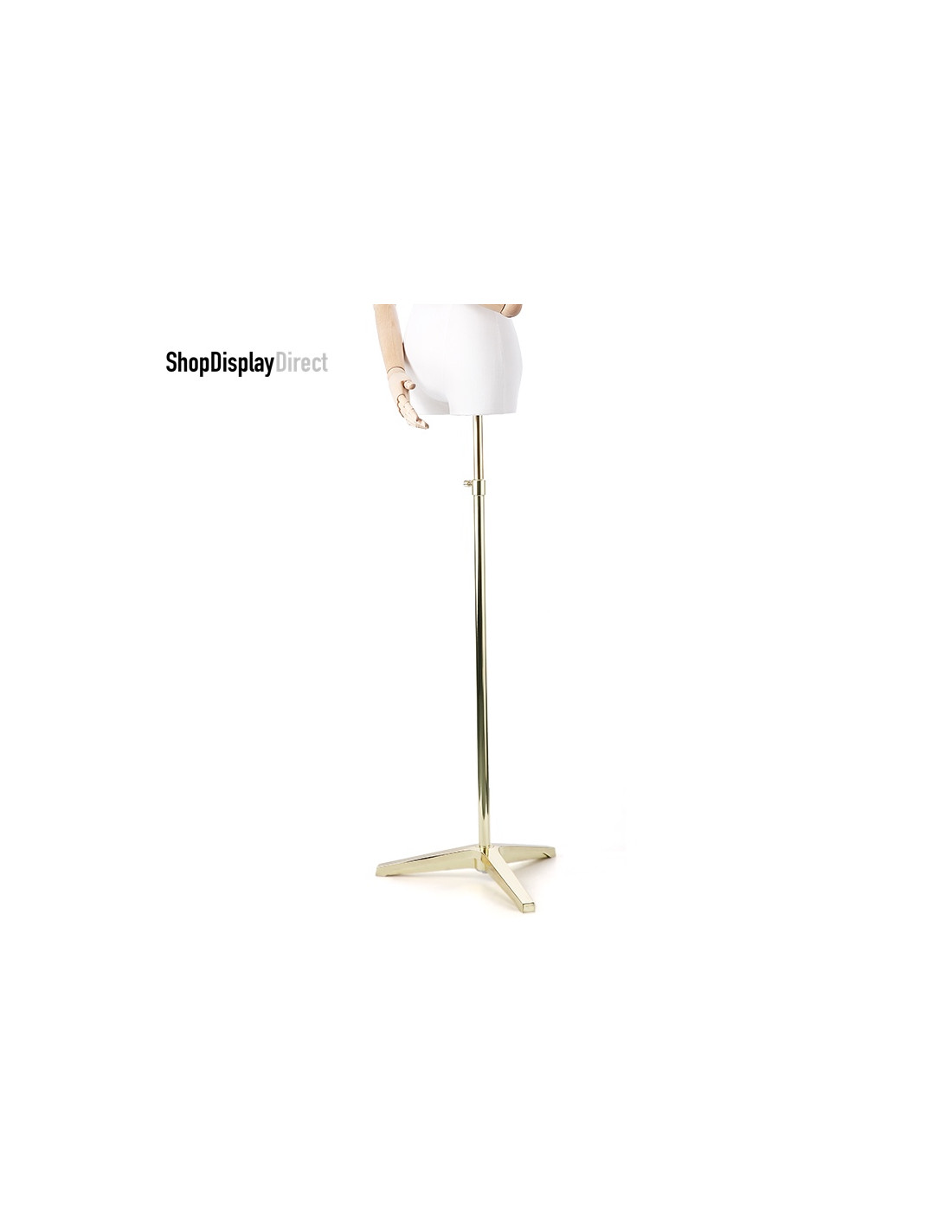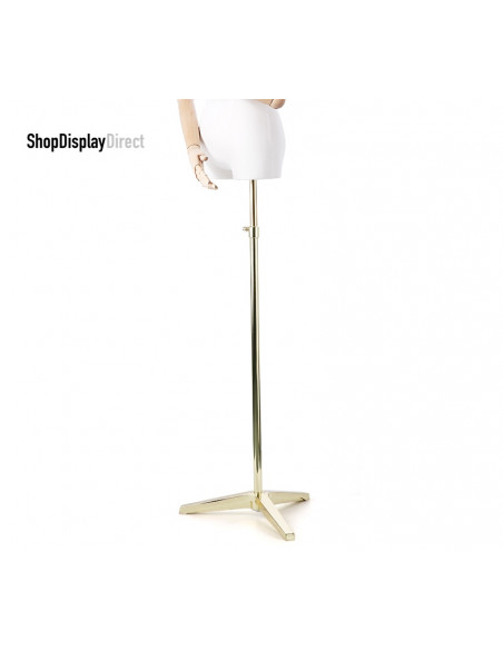 To support this articulated armed vintage male bust we supply a metal base stand with each unit. The stand connects to the mannequin torso to the centre or the left-hand side of the torso so it can fit through a trouser leg.